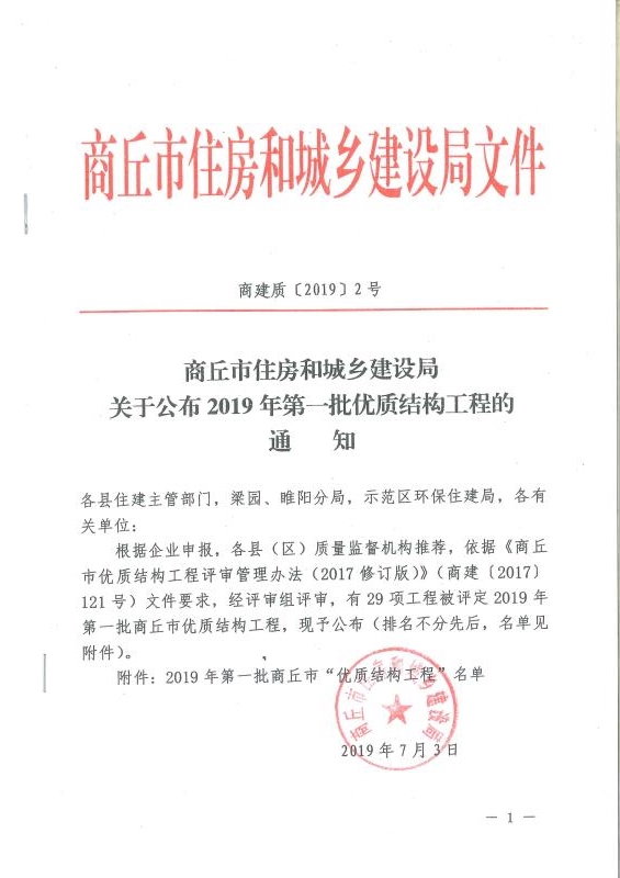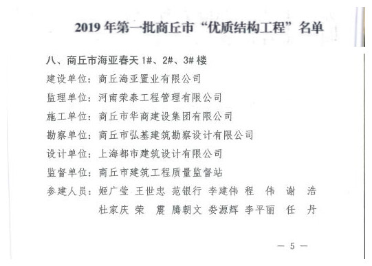近日,商丘市住房和城乡建设局文件公布了2019年度商丘市第一批优质结构工程奖获奖项目名单,我公司承建的海亚春天1#、2#、3#楼项目斩获该奖,商丘市“优质结构工程奖”是商丘市住房和城乡建设局的质量奖,是对我公司工作的认可,也是对我公司的激励,本次获奖为我公司的发展奠定了坚实的基础。